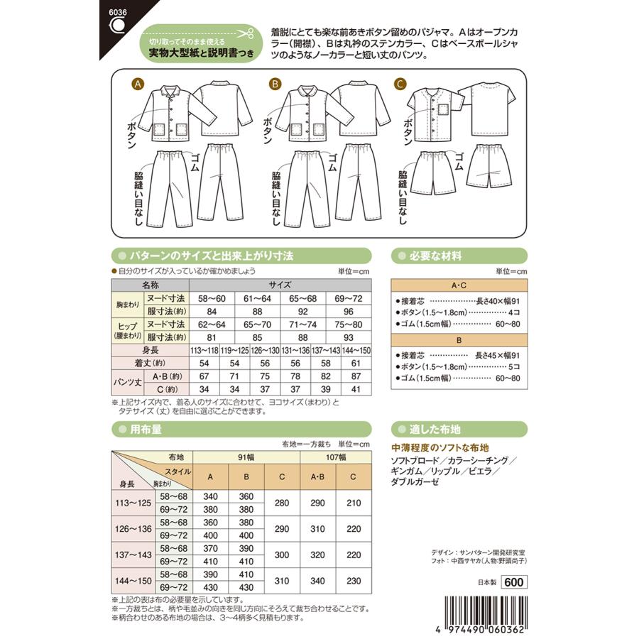 型紙 パターン 小学生パジャマ No 6036 小学生男女 身長113 150cm フィットパターン サンプランニング 大人 子供 ベビー 赤ちゃん 作り方 洋裁 6036 あなたの街のミシン専門店創作工房 通販 Yahoo ショッピング